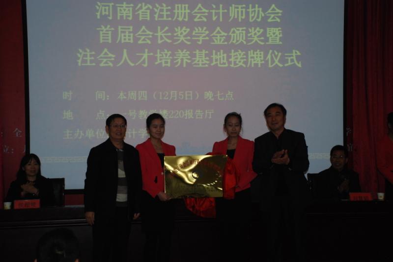 省注协副秘书长崔延铮宣读了河南省注册会计师首届会长奖学金表彰文件和建立注册会计师后备人才培养基地的文件。校党委副书记马书臣和省注协秘书长张连升共同为注册会计师后备人才培养基地揭牌并为获奖学生颁奖。